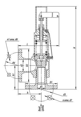 | DN, мм | PN, МПа | Tmax среды, ºC | Материал корп., сталь | Раб. среда | Раб. ход, mm | F, см² | Диапазон настройки клапана Рн, МПа | μ, не менее | n | n1 | d7, мм |